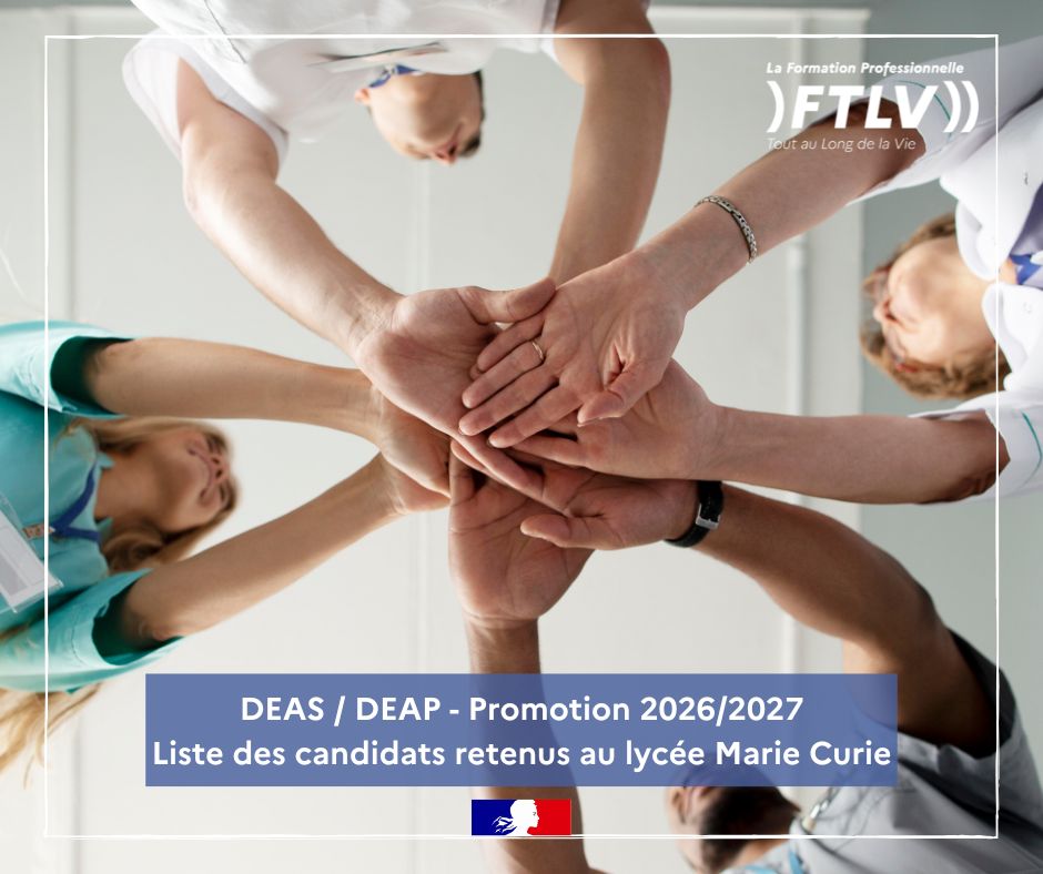 Les listes DEAS-DEAP par voie de l’apprentissage diffusées concernent exclusivement l’entrée en formation des promotions DEAS et DEAP 2026/2027 au lycée Marie Curie.