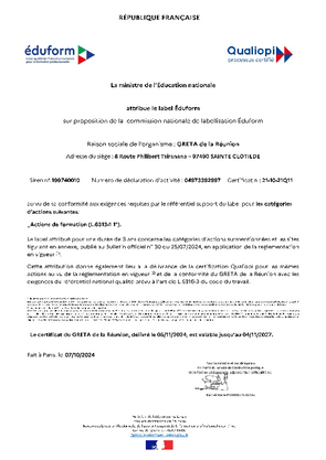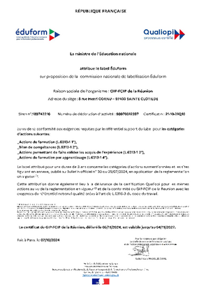 Le GRETA Réunion est labellisé EDUFORM et certifié Qualiopi pour les actions de formation.