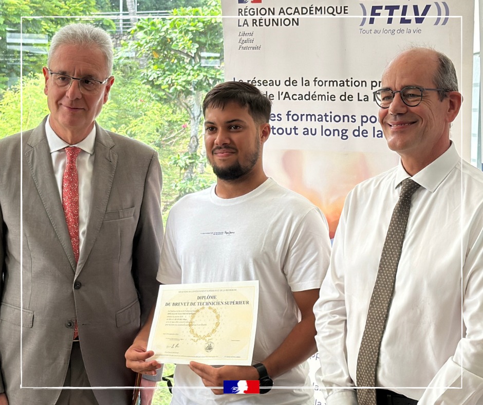 Ce matin, Hugo a reçu son diplôme dans les locaux de la DRAFPIC, en présence de Mr Rostane Mehdi, recteur de Région Académique de La Réunion, et de Mr Dominique Charzat, Directeur Régional chez EDF Réunion.