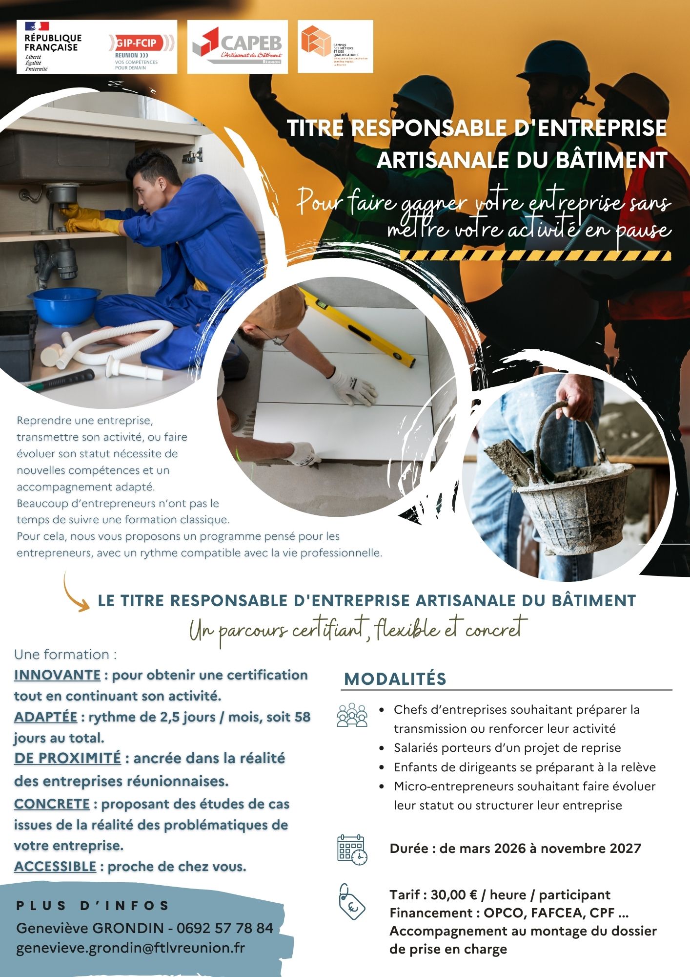 La formation à La Réunion démarre en mars 2026. Pour en savoir plus, contactez notre conseillère en formation professionnelle Geneviève Grondin par téléphone au 0692 57 78 84, ou par mail à l'adresse : genevieve.grondin@ftlvreunion.fr